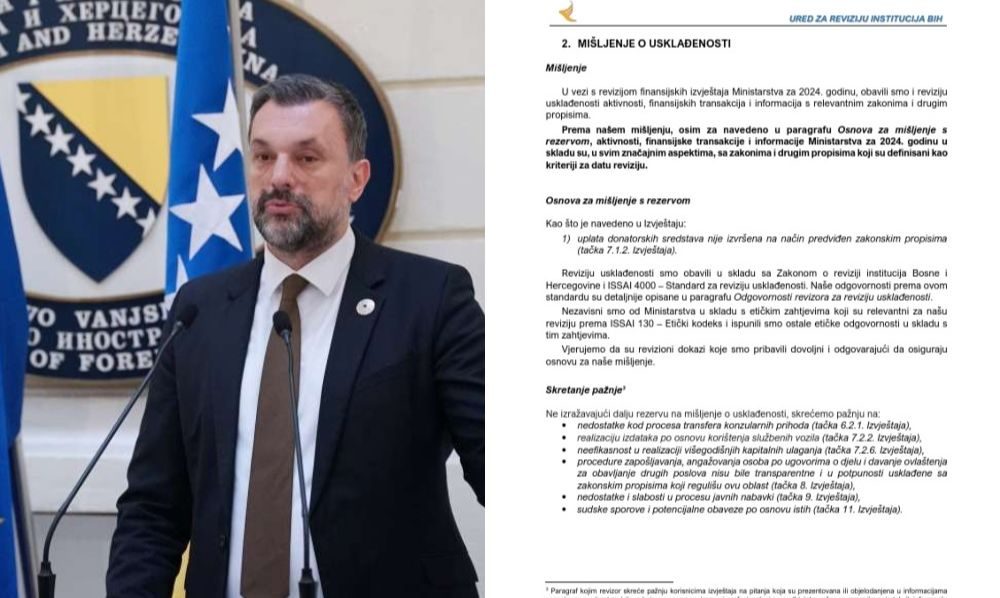 Ured za reviziju institucija Bosne i Hercegovine objavio je krajem juna finansijski izvještaj o radu Ministarstva vanjskih poslova BiH za 2024. godinu, koji otkriva čitav niz sistemskih slabosti, proceduralnih propusta i ponavljajućih nepravilnosti – od neregularnog zapošljavanja do neusklađenih budžetskih stavki i sumnjivih ugovora.